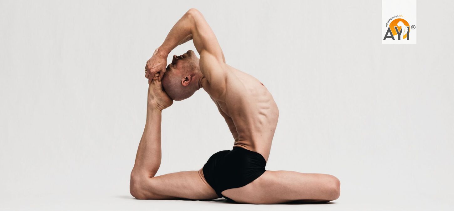 Effect: Rāja Kapotāsana deeply stretches the front of the hips (hip flexors/quadriceps), opens the chest and shoulder girdle, and at the same time strengthens the back line and glutes so the backbend is supported