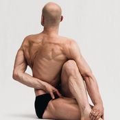 As you exhale, fold your left leg into Half Lotus and place your right foot on the outside of the left knee. Inhale, twist to the right, and take hold of your right foot with your left hand. Reach your right arm behind your back and find support at the left groin. Stay here until the fifth inhalation. On the fifth exhalation, unfold your legs and place your hands on the floor.
