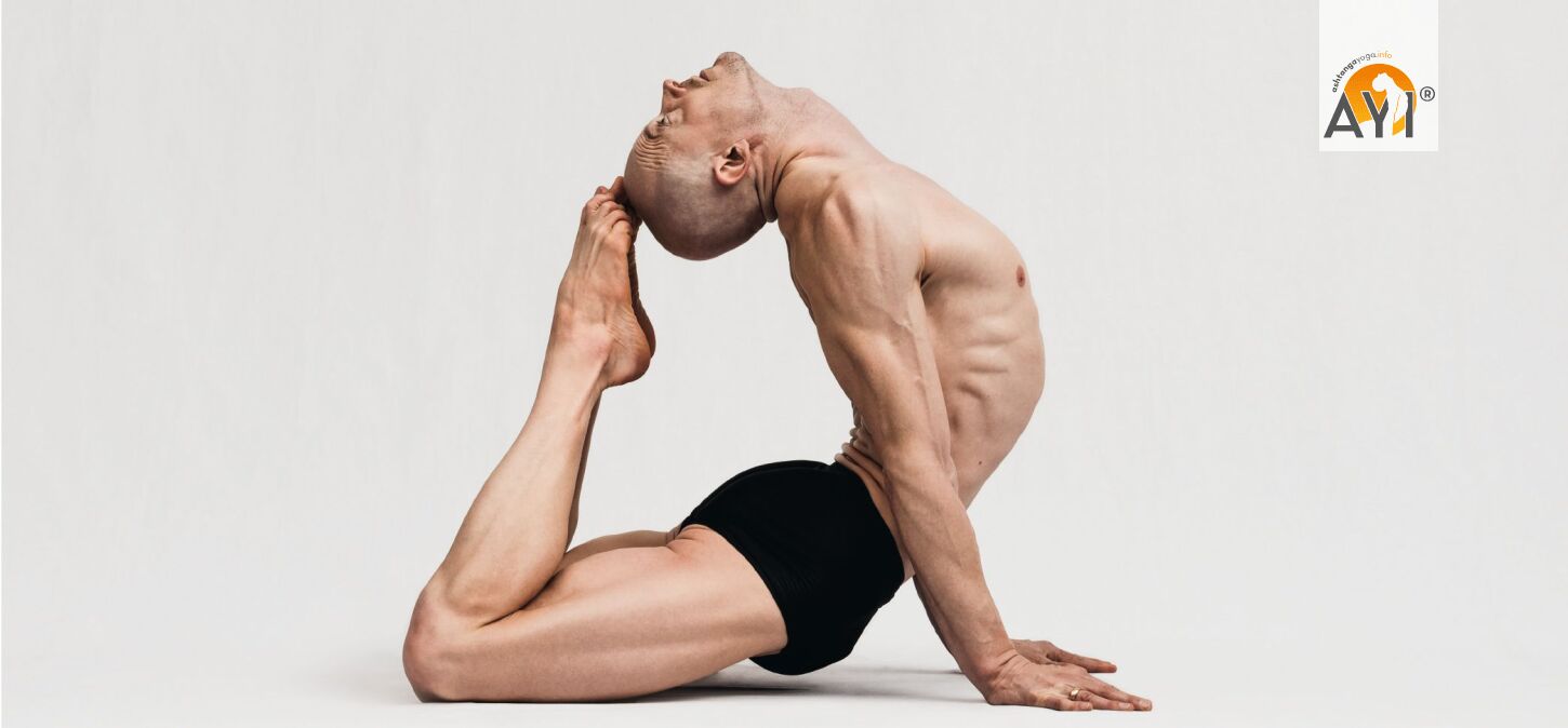 Effect: Rāja Kapotāsana deeply stretches the front of the hips (hip flexors/quadriceps), opens the chest and shoulder girdle, and at the same time strengthens the back line and glutes so the backbend is supported