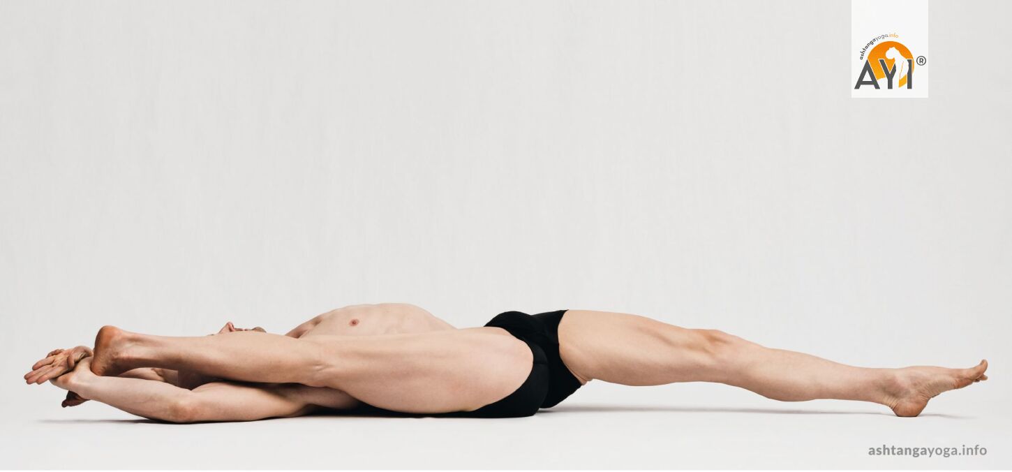 Effect: Supta Trivikrāmāsana primarily opens external rotation in the hip and stretches the back line of the leg, while the pelvis and trunk should remain stable. Practiced cleanly, the posture develops a clear leg line, improves hip mobility, and has a balancing effect on the pelvis.