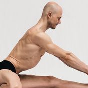 From “Downward-Facing Dog,” push off as you inhale. Glide forward and up into a balance on the hands. During the exhalation, keep your legs firmly together and draw them straight through between the arms. Finally, inhale into a seated staff pose with the legs extended.