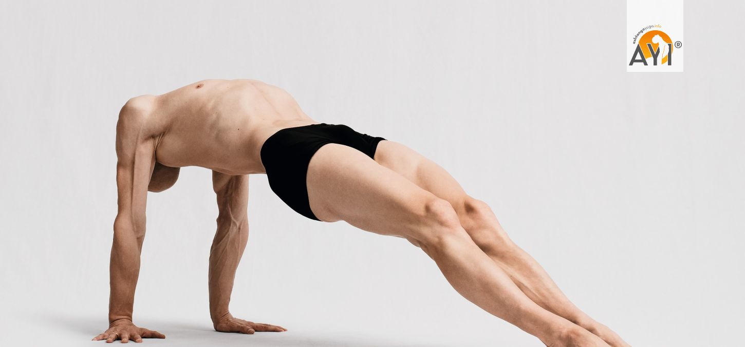 Po weit: Das Iliosakralgelenk ist zwar ein relativ straffes Gelenk, doch sein kleiner Gelenkraum mach vor allem in dieser Haltung einen großen Unterschied. Es scheint auf den ersten Blick kontraproduktiv die Beine aus dem Becken in eine Innenrotationsspannung zu bringen. Denn damit beugen sich die Knie. Doch genau diese Innenrotationsspannung erzeugt Weite im Iliosakralgelenk. Belasse während Du Deinen Oberkörper nach oben und hinten schiebst Deine Fußsohlen fest verwurzelt. Dies erhält die einmal aufgebaute Weite im Iliosakralgelenk und es entsteht die Freiheit Dich höher in die Haltung zu heben.