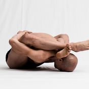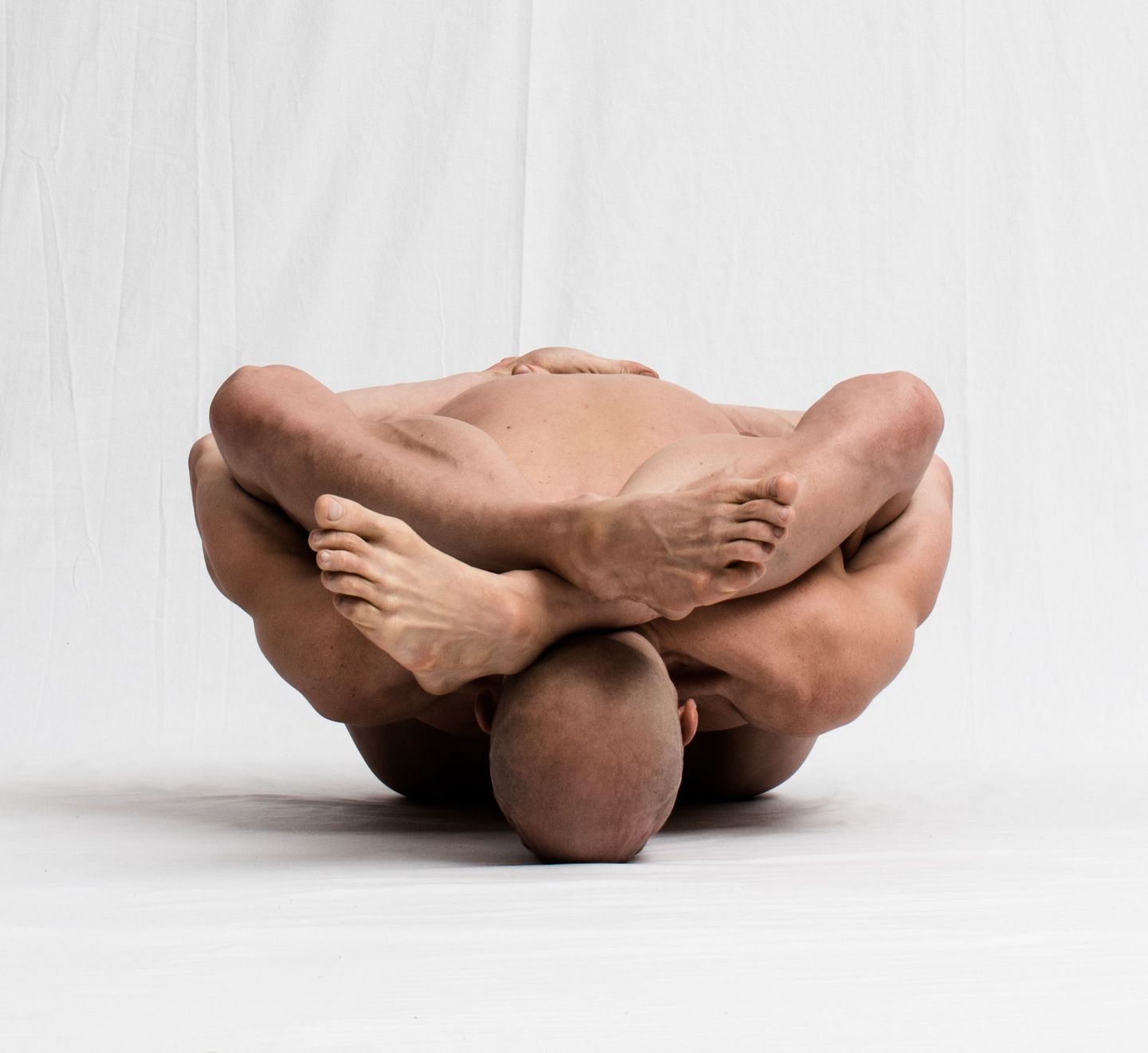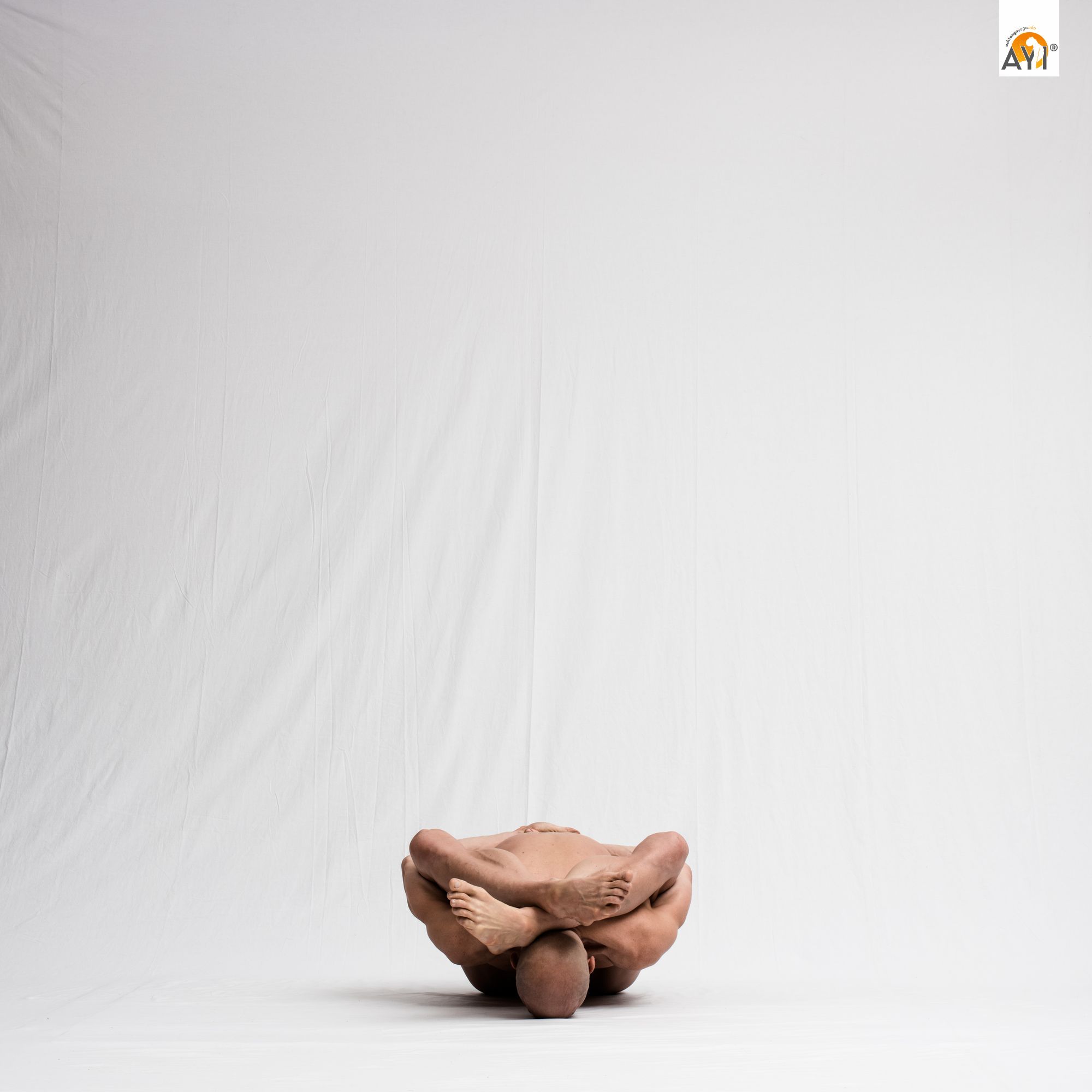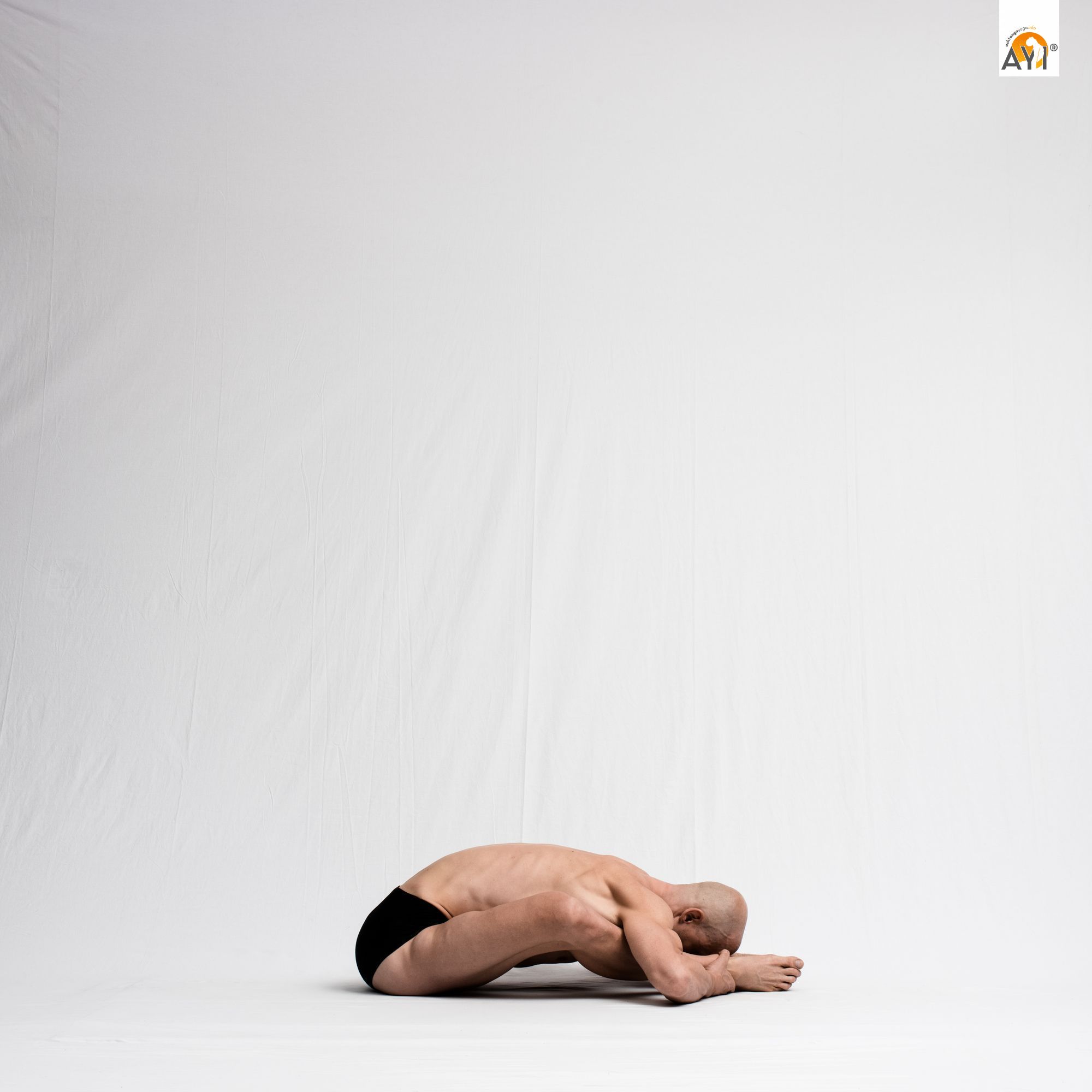 Für die gebundene Haltung der Arme ist es verlockend, unter den Oberschenkeln hindurch zu greifen. Dieser Griff nach hinten erzeugt einen unguten Hebel auf die Schultergelenke und drückt den Oberarmkopf in seiner Gelenkpfanne nach vorne. Befasse Dich deshalb erst mit der gebundenen Armhaltung, wenn Du in der Basic Form mit den Ellenbogen vor den Schienbeinen den Boden berührst. Nun kannst Du die Schulterblätter so weit vor die Oberschenkel schieben, dass der Griff nach hinten mühelos gelingt.