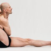 Tip: Drawing the right foot forward under the left armpit is demanding while sitting upright. It often becomes easier if—right after taking the right-hand grip on the right shin—you lean diagonally down to the left. Support yourself on the left arm to the side, with the elbow bent about 90 degrees. With this support, it is much easier to pull the instep of the right foot forward under the left armpit. Then you can sit back up.