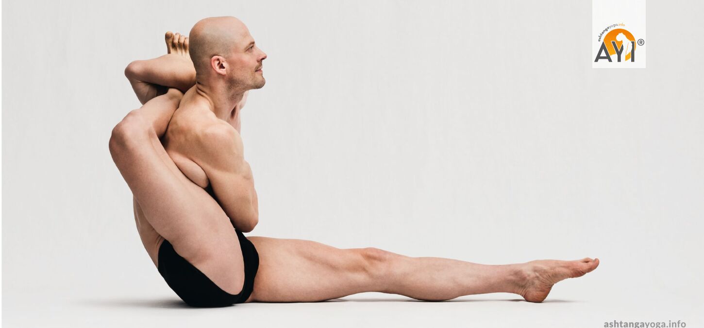 On the exhalation, reach with the right hand under the left armpit to the right shin. Draw the right foot deeper along the back and then forward under the left armpit. Circle the left upper arm back over the instep of the right foot and grasp the right wrist with the left hand. Remain in Buddhāsana until the fifth exhalation.