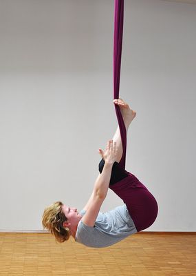 Ingrid: It really depends. In Aerial Yoga you can experience highly strengthening but also very calm and relaxing moments. Here at Ulm, we will focus on practicing the asansas in a rather dance-inspired and acrobatic fashion.