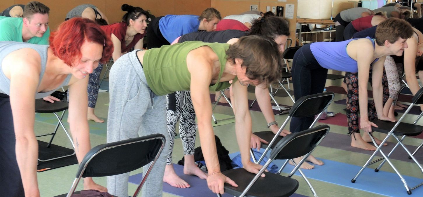 Der Clou ist, dass der Count der Stuhl-Variation mit der klassischen Serie übereinstimmt. So dass mit etwas Übung alle Ashtanga-Yogi*nis wieder zusammen praktizieren können.