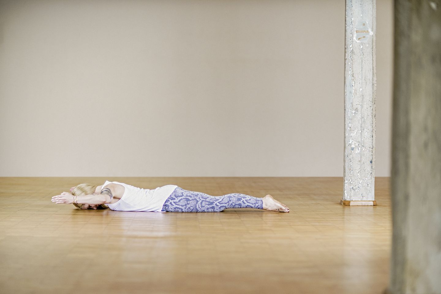 The starting position for the next exercises is also prone. Extend your arms to the sides and bend your elbows to 90 degrees. The hands face each other and the fingers are pointing forward. Leave your forehead on the floor as you lift the arms up away from the floor.